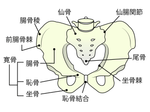 骨盤は大きな3つの骨(中央の仙骨と左右の寛骨)からなり(下図参照)、