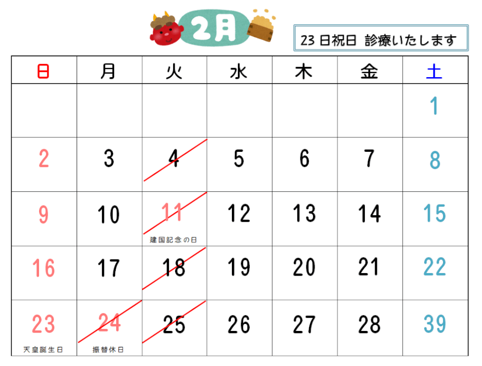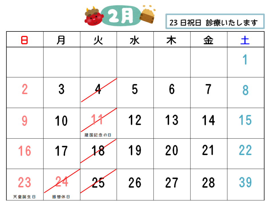 2月の休診日ですが、23日日曜日が天皇誕生日で祝日となりますが診療いたします!