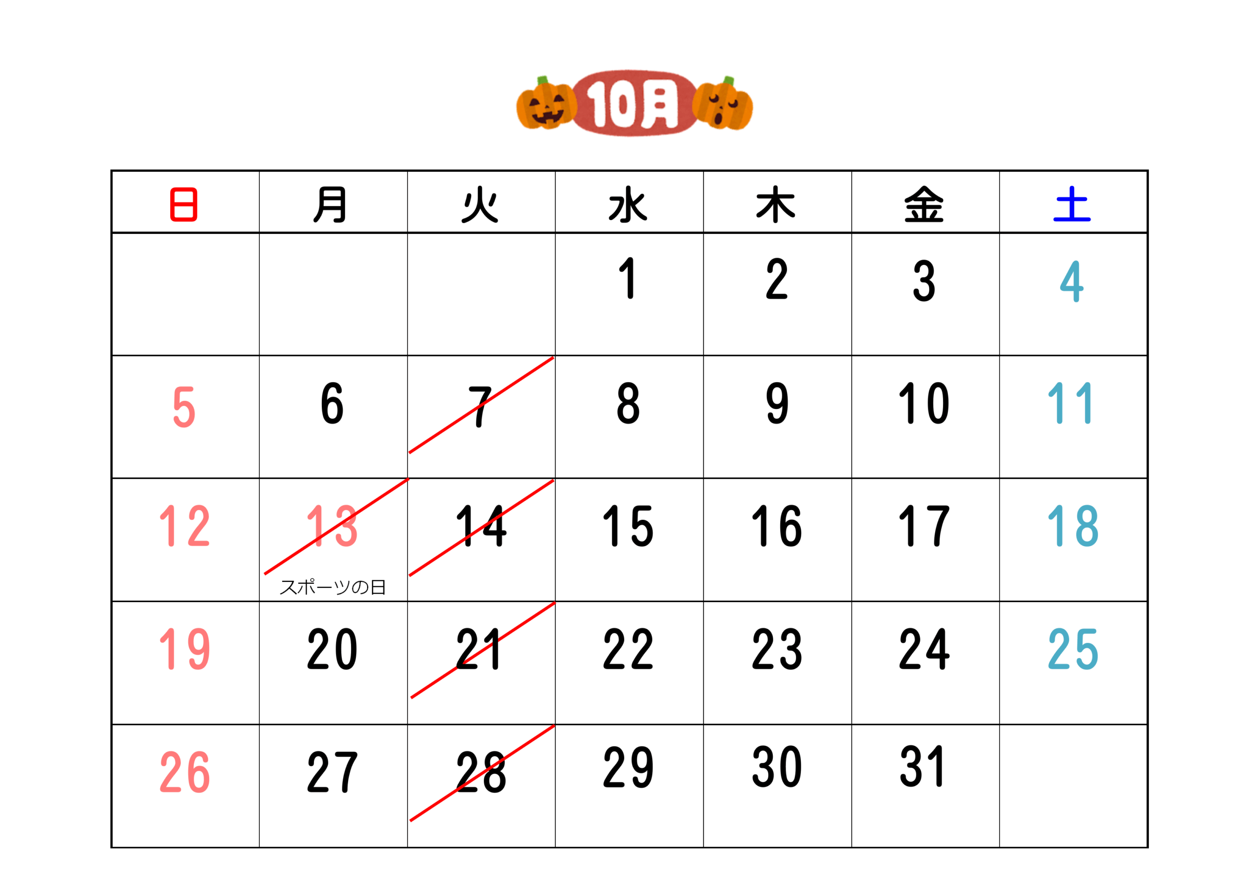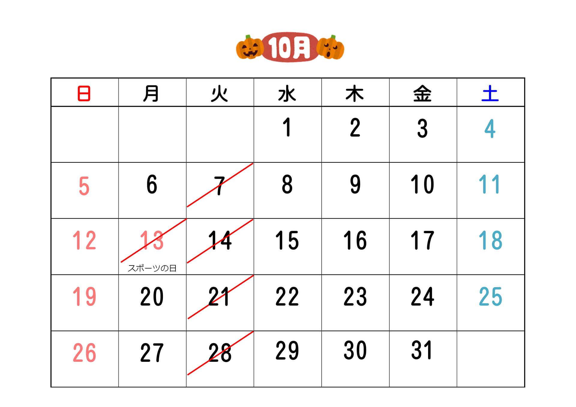 10月の休診日 お知らせ 2025.10.0110月になりました。長い長い夏もやっとおとなしくなり過ごしやすい日が増えてきましたね。急に冷え込こともあるので体調管理にはお気を付けください。10月は13日月曜日がスポーツの日で祝日のため休診となります。定休日の14日火曜日と連休となりますのでご注意ください。